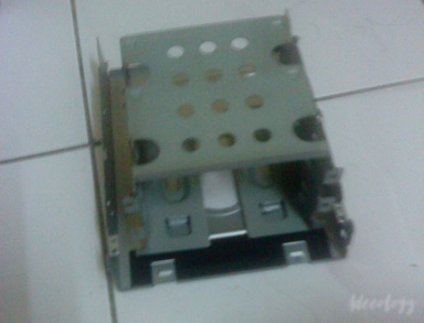 This DIY hard disk cage was made by combining a gutted generic casing’s hard disk rail with an optical drive. It rides on the optical drive’s bottom piece to allow it to be slotted into the casing.